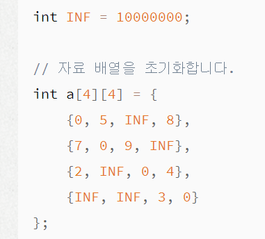 1. 이차원 배열에 정점에서 정점으로의 가중치를 저장을 해둔다.