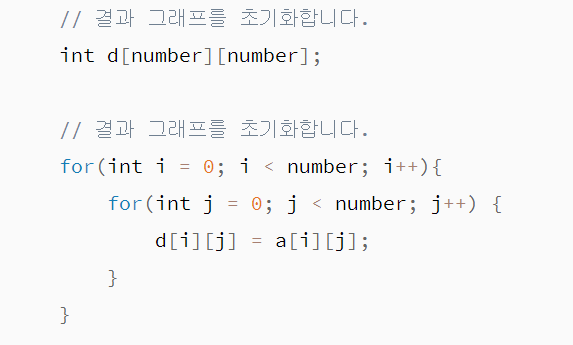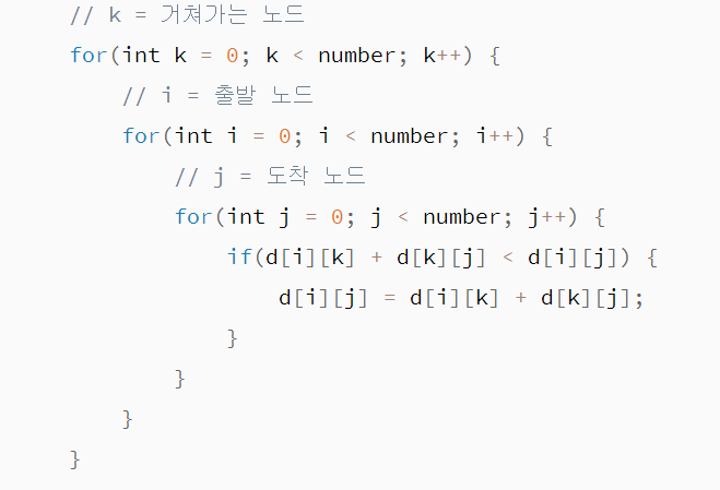 2. 이차원 배열을 갱신을 해주는데 이때 거쳐가는 노드를 기준으로 갱신을 해준다.