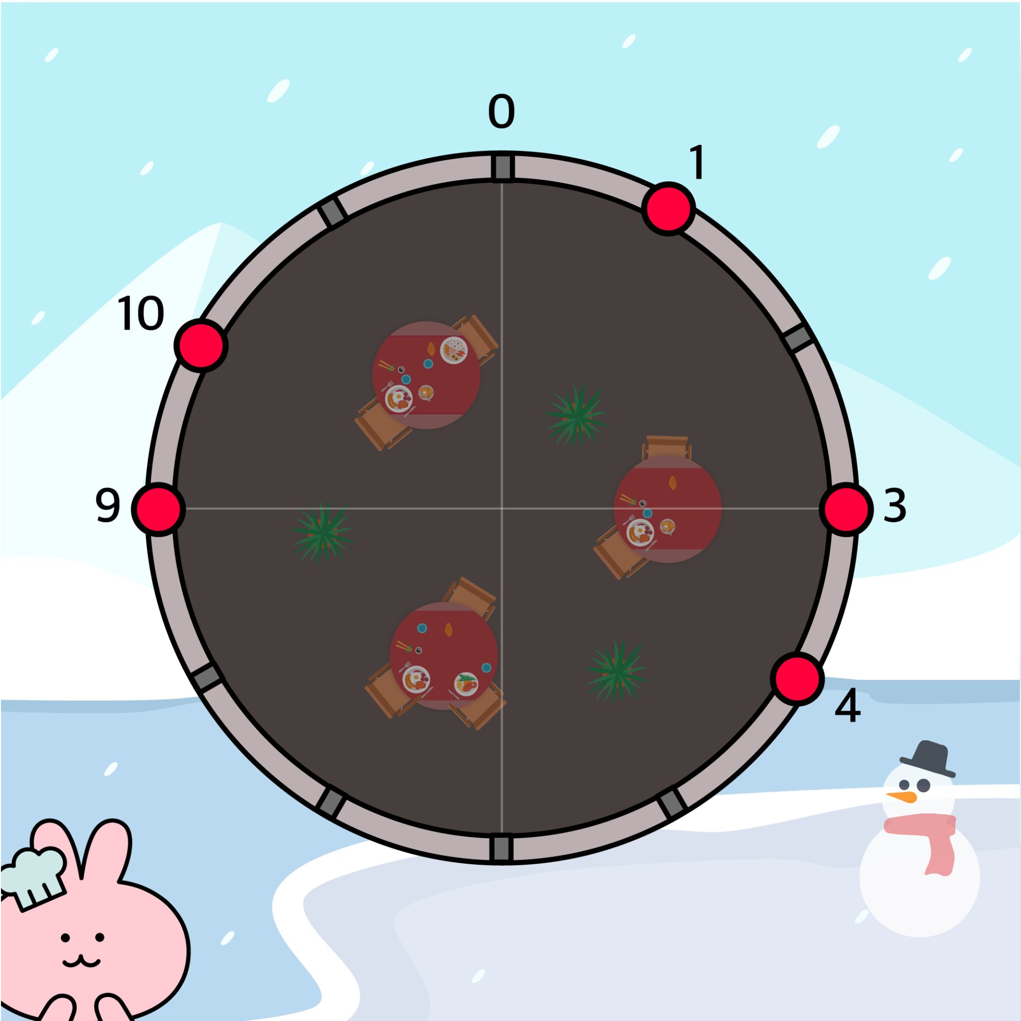 레스토랑의 구조는 완전히 동그란 모양이고 외벽의 총 둘레는 n미터이며, 외벽의 몇몇 지점은 추위가 심할 경우 손상될 수도 있는 취약한 지점들이 있습니다. 따라서 내부 공사 도중에도 외벽의 취약 지점들이 손상되지 않았는 지, 주기적으로 친구들을 보내서 점검을 하기로 했습니다. 다만, 빠른 공사 진행을 위해 점검 시간을 1시간으로 제한했습니다. 친구들이 1시간 동안 이동할 수 있는 거리는 제각각이기 때문에, 최소한의 친구들을 투입해 취약 지점을 점검하고 나머지 친구들은 내부 공사를 돕도록 하려고 합니다. 편의 상 레스토랑의 정북 방향 지점을 0으로 나타내며, 취약 지점의 위치는 정북 방향 지점으로부터 시계 방향으로 떨어진 거리로 나타냅니다. 또, 친구들은 출발 지점부터 시계, 혹은 반시계 방향으로 외벽을 따라서만 이동합니다.
