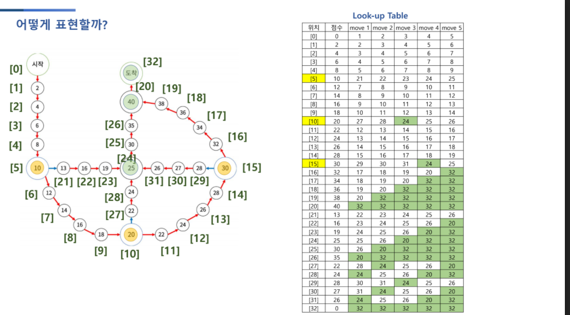 // 점수, 1칸움직였을때, 2칸 '', .....