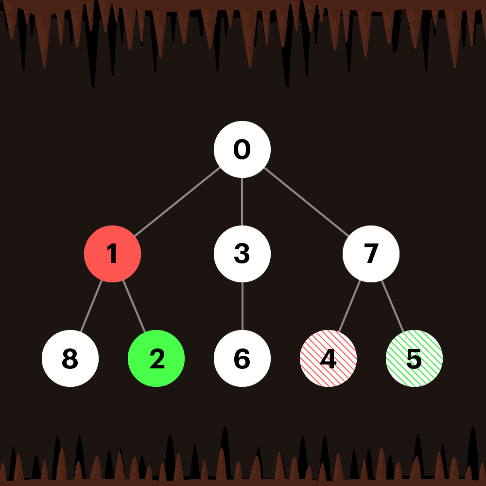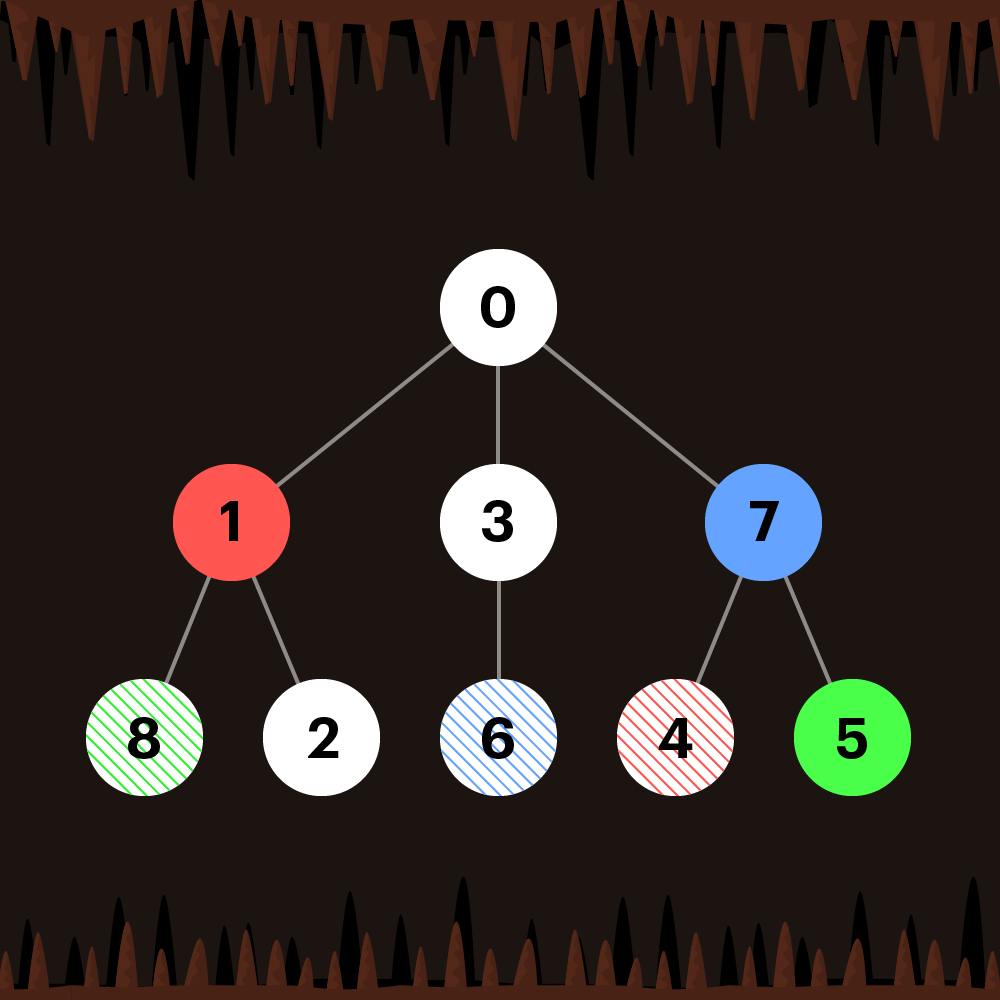 - 0번 → 3번 → 6번 → 3번 → 0번 → 7번 → 4번 → 7번 → 0번 → 1번 → 8번 → 1번 → 2번 → 1번 → 0번 → 7번 → 5번