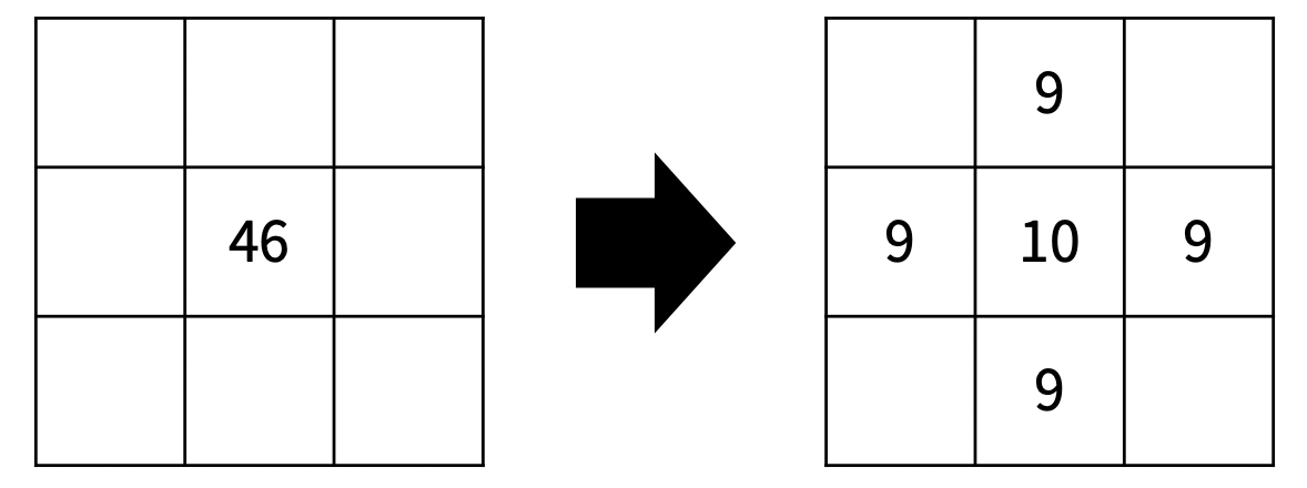 왼쪽과 오른쪽에 칸이 없기 때문에, 두 방향으로만 확산이 일어났다.