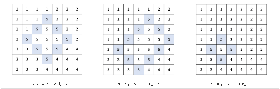 - 기준점 (x, y)와 경계의 길이 d1, d2를 정한다. (d1, d2 ≥ 1, 1 ≤ x < x+d1+d2 ≤ N, 1 ≤ y-d1 < y < y+d2 ≤ N)