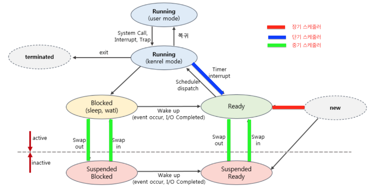 너무 많은 프로세스에게 메모리를 할당해서 성능이 저하되는 경우 이를 해결하기 위해 메모리에 적재된 프로세스 수를 동적으로 조절하기 위해 추가된 스케줄러. 만약 메모리에 많은 수의 프로세스가 적재되어 프로세스당 보유하고 있는 메모리양이 극도로 적어지게 되면 CPU 수행에 당장 필요한 프로세스의 주소 공간조차도 메모리에 올려놓기 어려운 상황이 발생하게 된다. 그렇게 되면 디스크 I/O가 수시로 발생하게 되어 시스템의 성능이 심각하게 저하될 수 있다. 이런 경우 메모리에 올라와 있는 프로세스 중 일부로 부터 메모리를 통째로 빼앗아 그 내용을 디스크의 스왑 영역에 저장해 둔다. 이와 같은 행위를 스왑 아웃(swap out)이라고 한다. Blocked suspended가 먼저 일어난다.