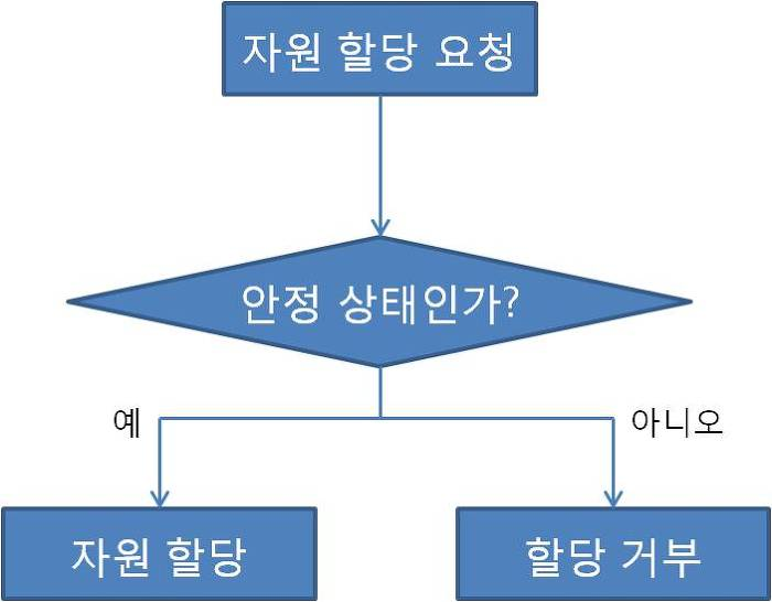안정 상태에 있으면 자원을 할당하고 그렇지 않으면 다른 프로세스들이 자원을 해제할 때까지 대기한다.