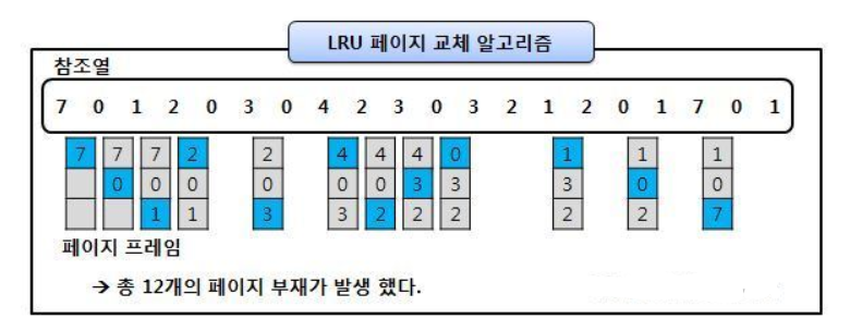 - 즉, 물리적 메모리 내에 존재하는 페이지 중에서 과거에 참조 횟수가 가장 적었던 페이지를 내쫓고 그 자리에 새로 참조될 페이지를 적재한다.