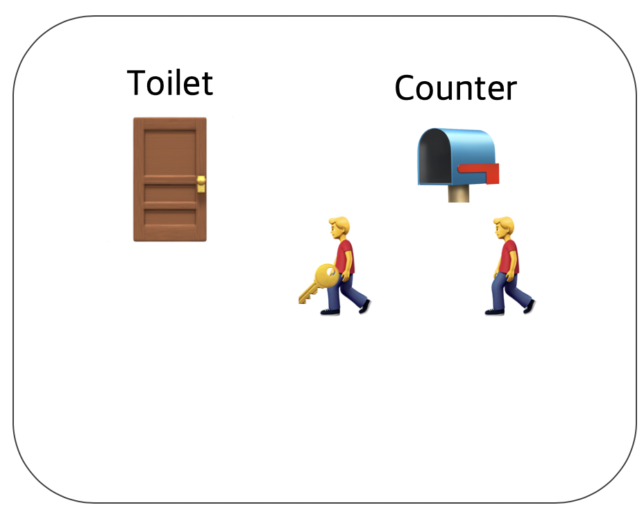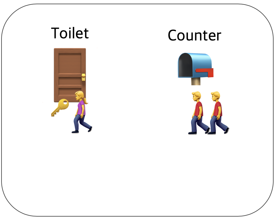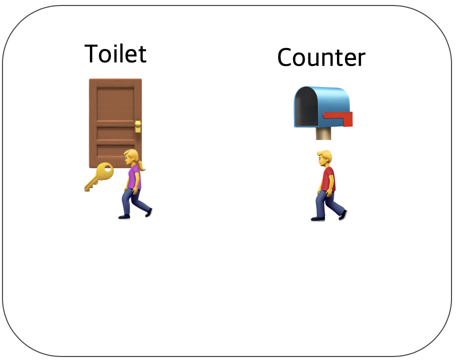 이제 당신이 화장실에서 나와 카운터에 키를 돌려놓았다. 이제 기다리던 사람들 중 맨 앞에있던 사람은 키를 받을 수 있고 이를 이용해 화장실에 갈 수 있다.