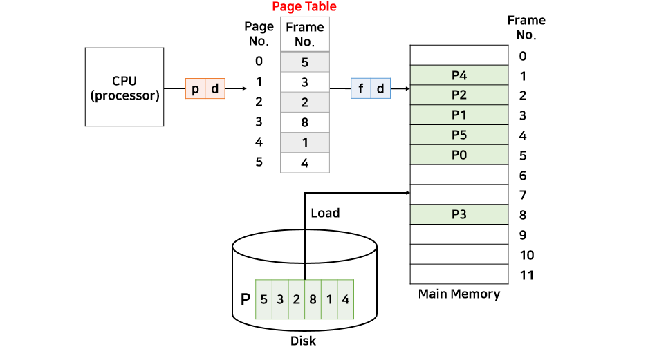 - 프로세스 P1은 5개의 페이지로 나눌 수 있다. 이를 메인 메모리 5곳에 나눠서 할당했다.